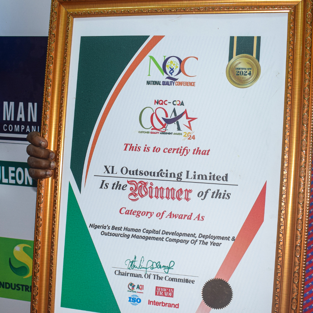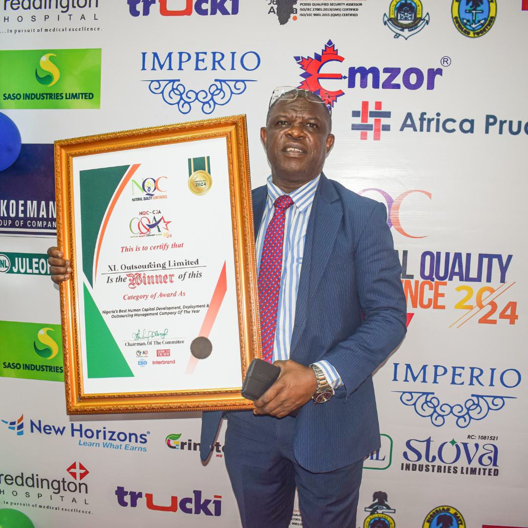 XL Outsourcing Limited Wins Top Award Nigeria's Best Human Capital Development, Deployment & Outsourcing Management Company of the Year Awarded at: Quality Control Conference, Lagos.